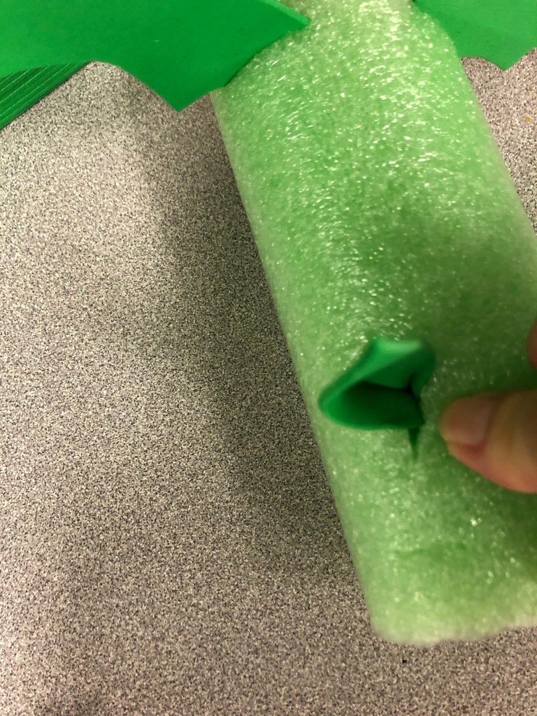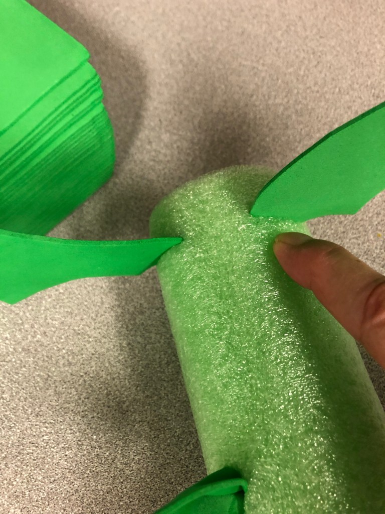 - Add the eyes, pom poms, teeth, and poke your green pipe cleaners where you want some spikes. Stack your tissue paper and make cuts to about 2 inches from the end. Roll the tissue paper into a tube and (insert it into the noodle… no glue needed). Enjoy your fire breathing dragon.
