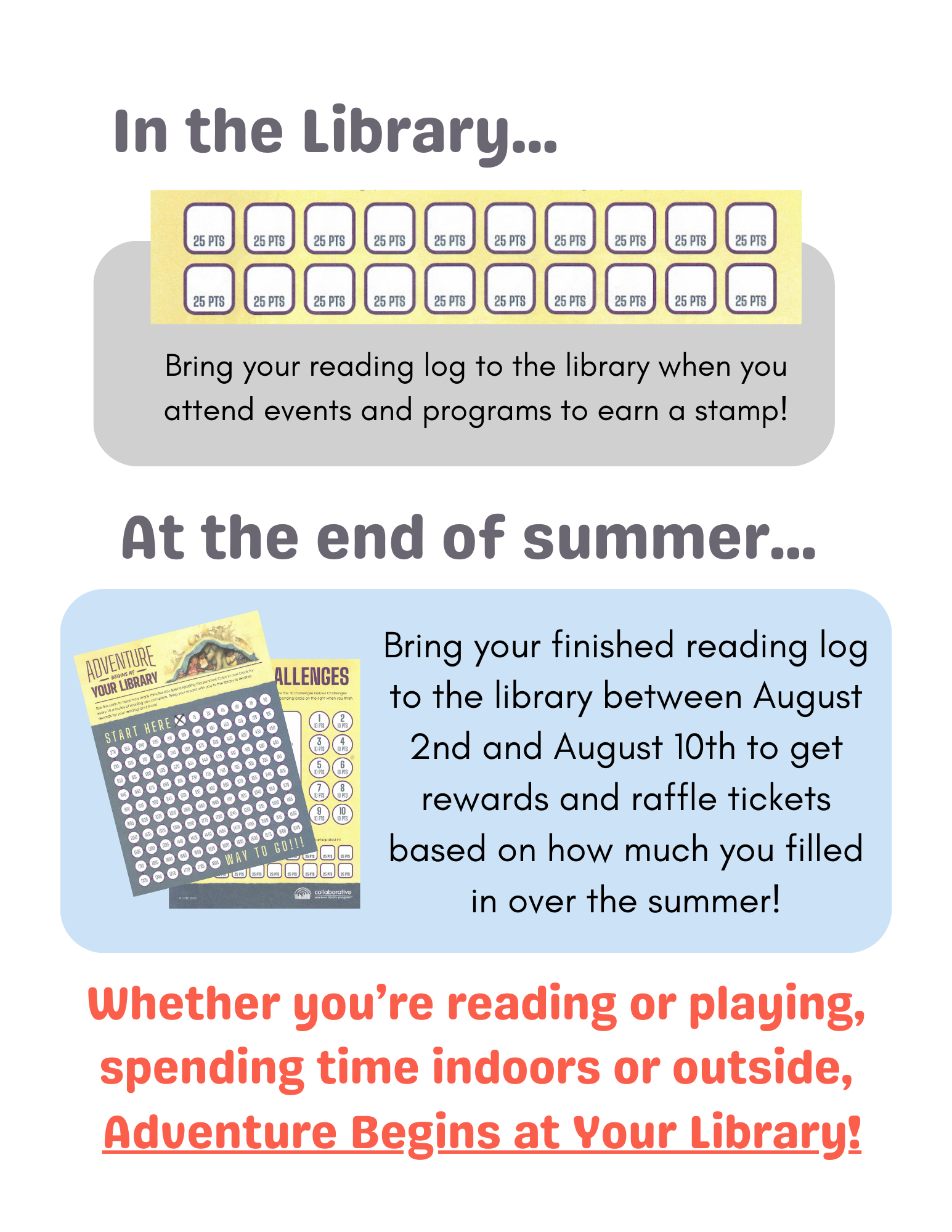 Children will earn a raffle ticket just by showing their reading logs, whether or not they were able to complete them, and earn more if you reach reading and adventure milestones! There will be four different raffles to choose from, meaning children can enter multiple or try their luck by putting all their tickets in for one.